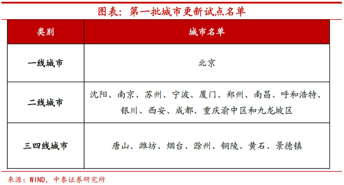 城市更新行动推进,试点城市打造样板。去年政府工作报告中提到要实施城市更新行动,完善住房市场体系和住房保障体系,而近期住建部工作会议明确要“稳妥实施城市更新行动”。去年11月住建部公布了第一批包含21个城市的城市更新试点名单,而这在今年各地的政府工作报告中也有所呼应。如渝中和九龙坡两区列入试点名单的重庆市,在今年工作中提到要“持续推进城市更新试点示范项目,新开工改造1277个城镇老旧小区,实施1.5万户棚户区改造”。北京市也提到要“落实城市更新行动计划。有序推进老旧楼宇、老旧厂房等6大类更新项目,完成老楼加装电梯200部以上,支持配合央属产权单位老旧小区改造”,打造城市更新样板。