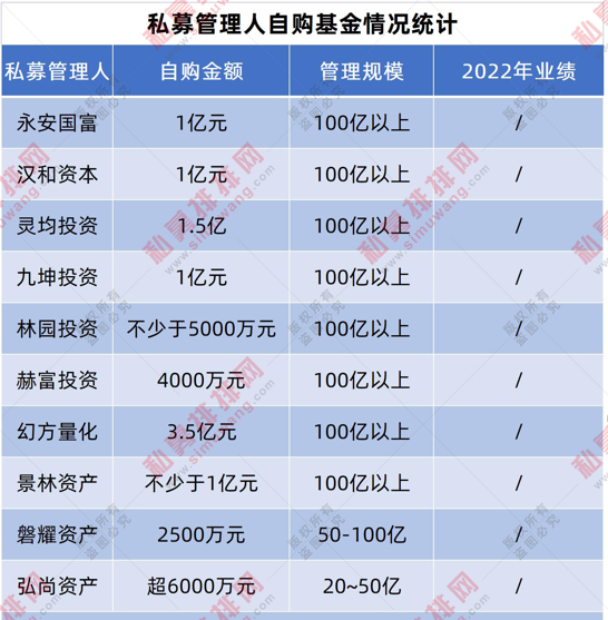私募排排网不完全数据显示,目前已有包括汉和、景林、九坤、幻方量化、赫富、永安国富、林园投资、灵均在内的8家百亿私募管理人,以及弘尚、磐耀两家50-100亿的私募宣布自购,拟/已自购金额合计10.25亿元。