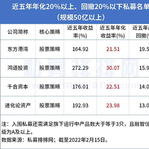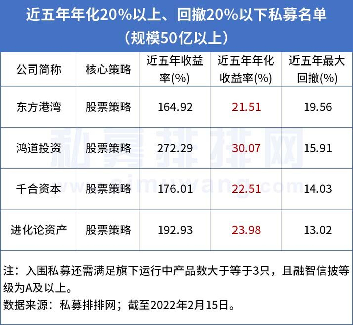 以“近五年年化收益大于等于20%”、“近五年最大回撤小于等于20%”为业绩标准选出的私募管理人中,百亿私募达到了3家,它们分别是东方港湾、千合资本、进化论资产。