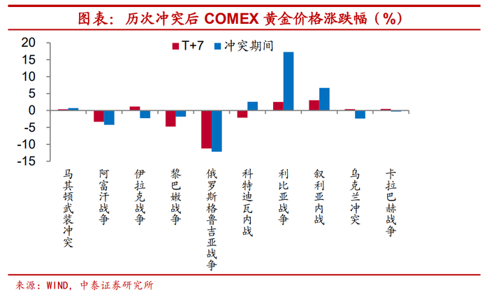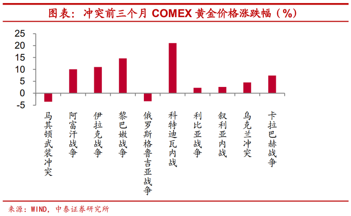 冲突爆发后,黄金价格并不必然上涨。当战争正式开始或战局明朗后,黄金价格并不必然上涨,在新世纪以来的十次地缘政治冲突期间,黄金价格5次上涨与5次下跌。一般而言,战前市场已有充分预期,而战争正式开始后,在利空出尽的背景下,黄金价格有回落的可能。