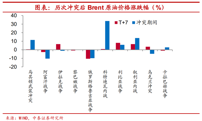 中东地区冲突多会带动油价走高。从历次地缘冲突爆发后油价的变化来看,涉及中东地区的地缘冲突期间,油价大部分呈上涨态势,如伊拉克战争爆发后的7个交易日,布伦特原油显著上涨6.6%,利比亚战争和叙利亚内战期间,原油价格也均有上涨。但即便是主要原油生产国参与的战争期间,原油价格也不一定上涨,如2008年俄罗斯格鲁吉亚战争期间,原油价格整体呈下行态势。除了战争外,供需基本面、突发事件后战略石油投放和宏观经济环境等对油价也有较大影响。