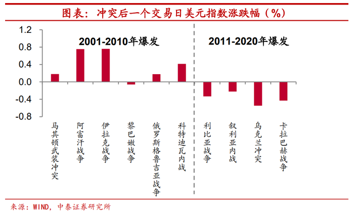 近年来,冲突爆发短期多会导致美元走弱。最后,从美元指数的走势上来看。一般而言,在地缘政治冲突等“黑天鹅”事件发生后,避险情绪升温将导致市场对美元的需求提升,从而使得美元指数上行。在新世纪以来的十次冲突爆发后一天内,美元指数似乎以2011年为节点存在明显的分化,2001至2010年爆发的冲突多会带动美元升值(除黎巴嫩战争爆发后美元指数微幅回落);而2011年后,在冲突爆发的背景下,美元指数却不升反降。