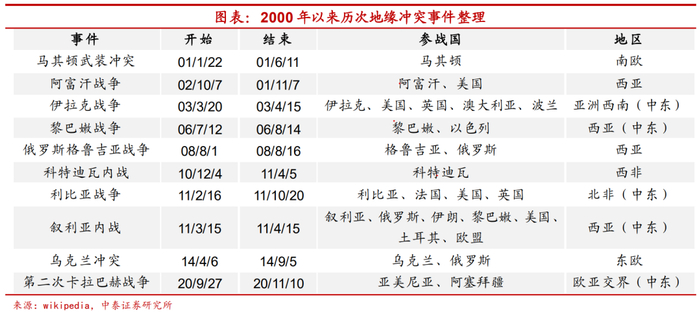 从2000年以来,全球来看共经历过马其顿武装冲突、阿富汗战争、伊拉克战争、黎巴嫩战争、俄罗斯格鲁吉亚战争、科特迪瓦内战、利比亚战争、叙利亚内战、乌克兰冲突和第二次卡拉巴赫战争等10次比较典型的地缘政治冲突事件。由于历次冲突的规模、持续时间、波及范围等均有不同,对各类资产的影响程度也不尽相同,但整体来看,局部地区的冲突爆发对大类资产的走势影响有限。(更正:下表阿战争始于01/10/07)