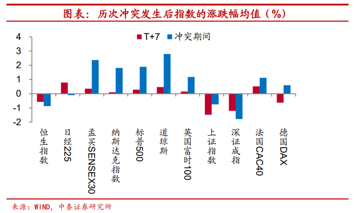 冲突事件对于股市的冲击持续时间较短。不过,从历次指数变化的均值来看,冲突后7个交易日,多数指数已经由跌转涨。如果进一步观察地缘冲突持续的整个时期内指数的表现,可以发现,拉长时间来看,地缘政治冲突事件对权益市场的影响较为有限。在历次冲突期间,上证综指5次上涨与5次下跌、恒生指数6次上涨与4次下跌、标普500指数8次上涨与2次下跌,在整个冲突期间事件对于权益市场的冲击并不显著。