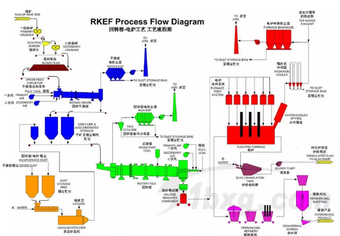 所谓的RKEF,指的是利用红土镍矿炼精制镍铁的回转窑-矿热炉工艺技术(Rotary Klin Electric Furnace),这是近年来新兴的镍铁冶炼技术,和传统的电炉(EF)相比有着明显优势。下面这张表格总结了它的工艺流程: