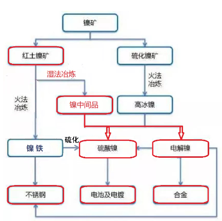 该消息带来了高冰镍供给端的变革。在传统的镍产业链中,高冰镍由硫化镍矿冶炼得到,而此次印尼高冰镍项目的供应意味着由红土镍矿冶炼的镍铁打通了转化为高冰镍的渠道。也就是说每年100万吨(金属量)原本用于生产不锈钢的镍铁,将可以转而生产硫酸镍,实现无缝对接!