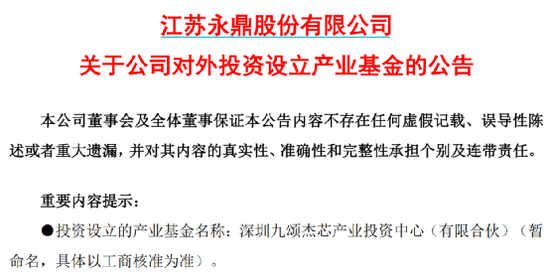 去年11月,永鼎股份也发布公告,根据公司自身发展规划,充分发挥产业优势和产业战略布局,江苏永鼎股份有限公司与上海九颂山河股权投资基金管理有限公司、上海敦荣信息科技有限公司、北京勤通耀达科技有限公司签署《产业基金意向合作协议》,共同投资设立深圳九颂杰芯产业投资中心(有限合伙)(暂命名,具体以工商核准为准)。
