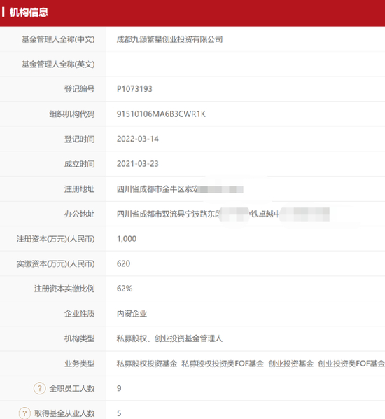 基金业协会网站信息显示,今年3月14日,一家名叫“成都九颂繁星创业投资有限公司”的机构完成私募基金管理人备案登记,机构类型是私募股权、创业投资基金管理人,目前公司有全职员工9人。这家新晋私募成立于去年3月23日,注册资本1000万元,实缴资本620万元,其注册和办公地都在四川成都。