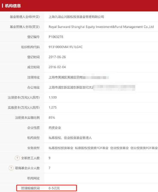 基金业协会网站信息显示,上海九颂山河股权投资基金管理有限公司成立于2016年2月4日,随后在2017年6月26日完成私募股权、创业投资基金管理人登记。目前公司有全职员工9人,管理规模区间在0-5亿元;目前旗下备案的私募基金产品有16只。