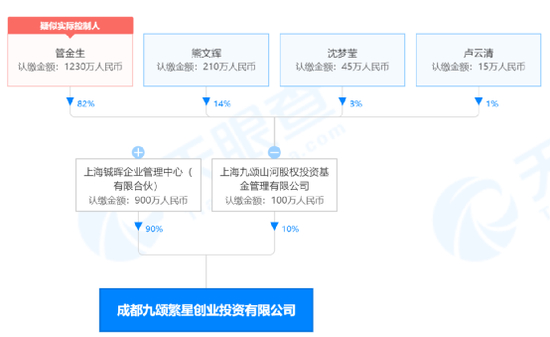 从股权结构来看,成都九颂繁星创业投资的股东有两位,上海铖晖企业管理中心(有限合伙)持股90%,上海九颂山河股权投资基金管理有限公司持股10%。值得注意的是,上海九颂山河股权投资基金的实际控制人、董事长是被称为“中国证券教父”的管金生,他还担任成都九颂繁星创业投资的董事长。