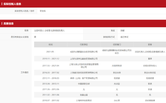 基金君还留意到,管金生的合伙人是敖鲲,他目前担任成都九颂繁星创业投资的法定代表人、总经理,从他的简历来看,曾经先后在上海同华投资集团、中国银联总部、承明(上海)资产管理有限公司、上海睿泽股权投资管理有限公司等任职,2017年3月加入上海九颂山河股权投资基金管理有限公司,担任合规风控负责人。