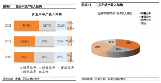 此外,三大房企还在逆周期时的主动求变,拥有穿越周期的卓越能力。分拆 2021 年三井与住友两家的业务可以看到,与房地产开发相关的业务均仅占 30% 左右,写字楼租金和物业管理收入比例较高。在行业进入成熟期后,管理、服务溢价使得运营的利润率也高于房地产开发。