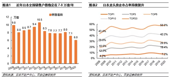 近年来,日本全国商品房销售规模基本稳定在 7-8 万套/年,总量稳定且市场集中度不断提升,2020 年 TOP20 房企市场集中度高达 58%,而三井不动产、三菱地所、住友不动产等三大房企穿越周期而屹立不倒,时至今日龙头地位稳固。