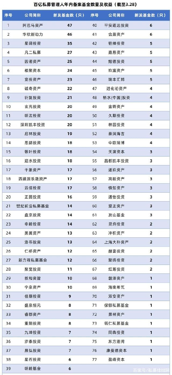 另从百亿私募一季度(截至3月26日)新基金发行情况来看,华软新动力、星阔投资、凡二私募证券基金、因诺资产、相聚资本、宽投资产等77家百亿私募共计备案了770只新基金,这也意味着,在115家百亿中,67.83%的百亿私募在今年已经筹划新产品,其中阿巴马资产、华软新动力新发基金数量均超40只。