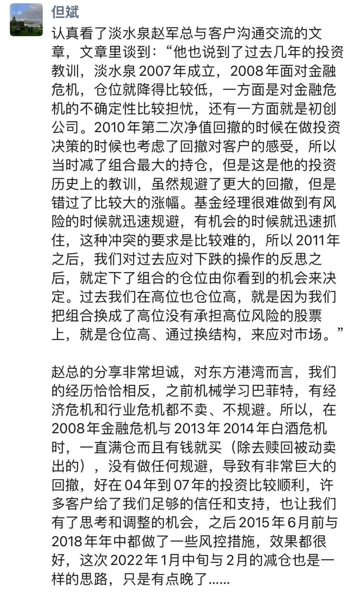 4月1日,但斌在微博回应表示,认真看了赵军的分享,非常坦诚。但东方港湾的经历恰恰相反,之前机械学习巴菲特,有经济危机和行业危机都不卖、不规避。在2008年金融危机、2013年以及2014年白酒危机时,一直满仓而且有钱就买(除去赎回被动卖出的),没有做任何规避,导致有非常巨大的回撤,好在04年到07年的投资比较顺利,许多客户给了足够的信任和支持,也让我们有了思考和调整的机会。