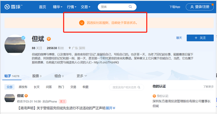4月6日,深圳东方港湾投资董事长但斌的微博显示“因违反相关法律法规,该用户目前处于禁言状态”。截至目前,但斌最后一条微博停留在4月5日晚。晚间最新消息显示,但斌雪球账号也被禁言。“因违反社区规则,目前处于禁言状态。”