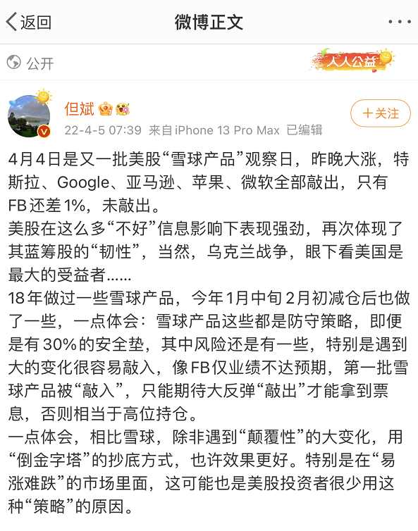 4月5日,但斌表示,“4月4日是又一批美股‘雪球产品’观察日,昨晚大涨,特斯拉、Google、亚马逊、苹果、微软全部敲出,只有FB还差1%,未敲出。”