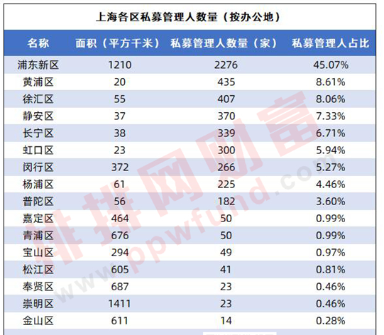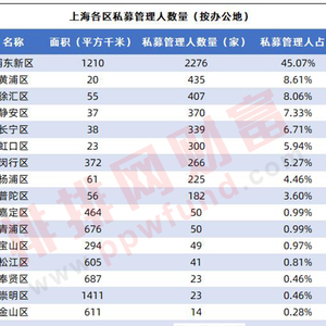 私募排排网统计数据显示,在上海的16个辖区中,私募集中分布在浦东新区,高达2276家私募办公地位于浦东,数量占比高达45.07%,管理基金数量达到23062只。除此之外,在黄浦区、徐汇区、静安区、长宁区等也均有分布超300家私募。