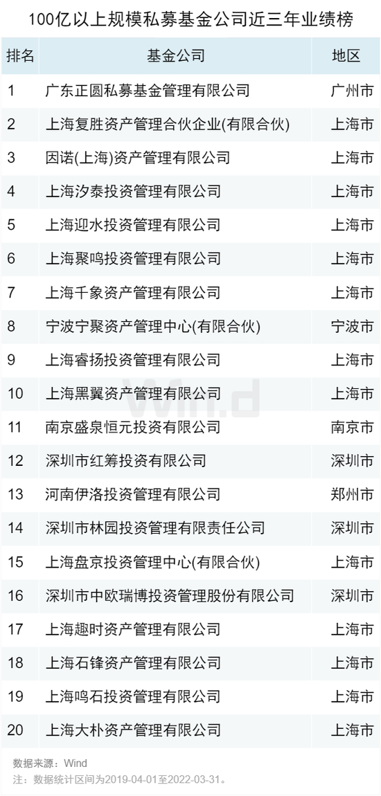按照在中基协备案的私募管理人规模数据统计,管理规模100亿以上的私募中,前20名公司近三年中位数收益率超150%。正圆私募、复盛资产、因诺资产居前。从地区分布来看,13家来自上海。