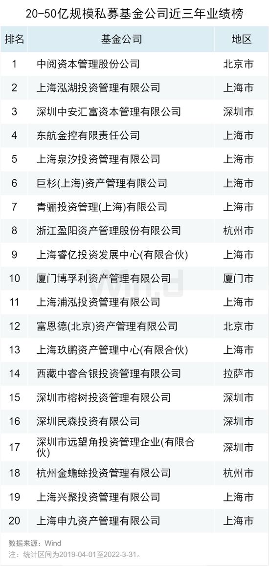 管理规模20-50亿的私募,前20家公司中位数收益率超过166%。中阅资本位居第一,泓湖投资、中安汇富资本位居二、三。从地区分布来看,上海9家,深圳4家。