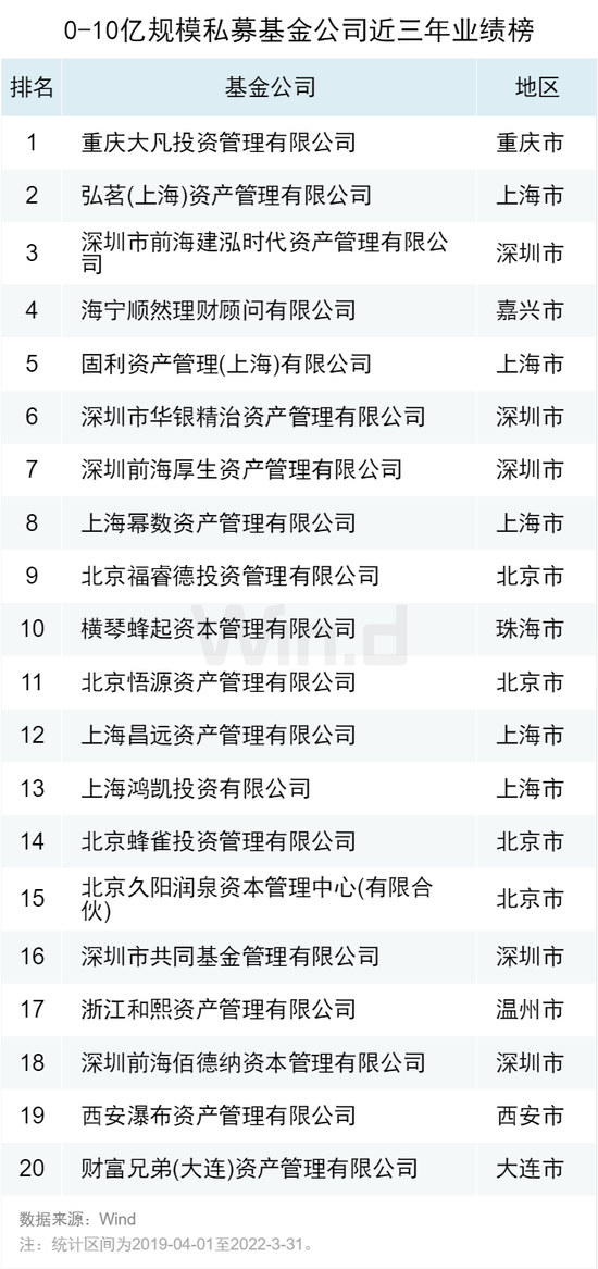 管理规模0-10亿的私募,Wind所评选出的20家公司中,近三年收益率中位数为230%,平均收益604%,在各规模基金公司中表现最优。大凡投资仍稳占该榜单头名位置。