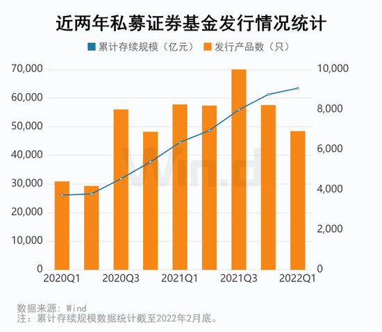 截至2022年2月底,私募证券基金存续数量79551只,其中一季度发行6921只,环比下降15.8%,从去年三季度以来发行热情持续递减。今年一季度私募证券基金累计存续规模达63420.45亿元,环比增长3.5%。
