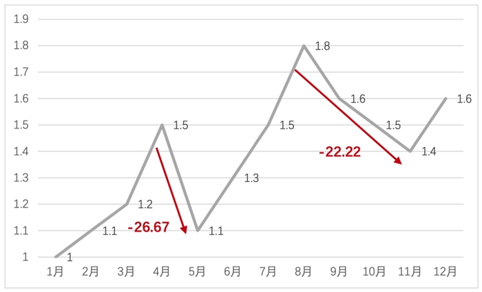 比如假设某基金一年内的净值走势如下图,总共经历了两次下跌。从4月的1.5元下跌到5月的1.1元,跌幅为26.67%。随后在8月上涨到1.8元,然后再次下跌到11月的1.4元,此次跌幅22.22%。那么这一年该基金的最大回撤是26.67%。