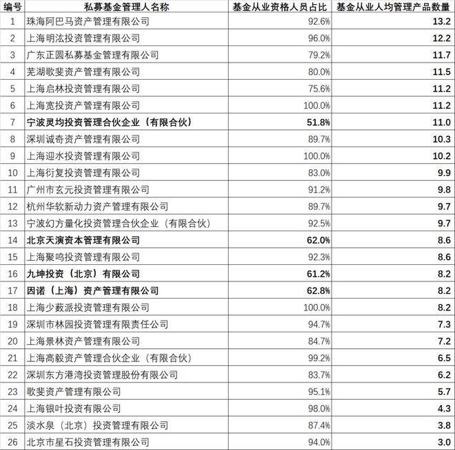 从员工人数来看,26家管理人全职员工人数最多的137人,最少的19人,平均53人;具有基金从业资格的人数最多的130人,最少的19人,平均44人。基金从业资格人数占比最低的是宁波灵均投资管理合伙企业(有限合伙),仅有51.8%。