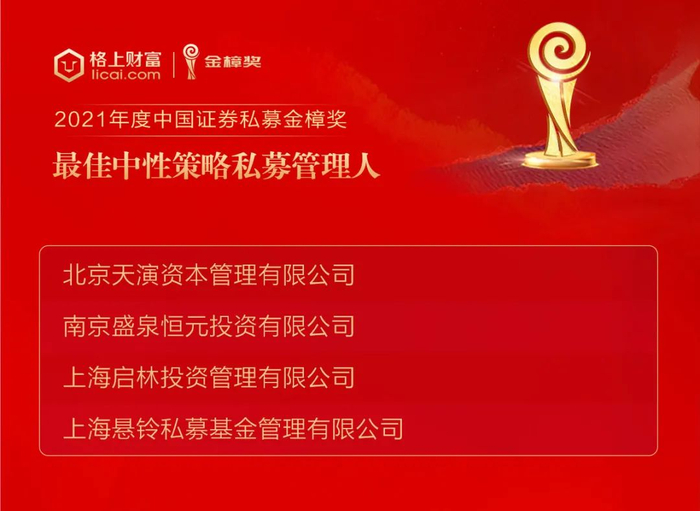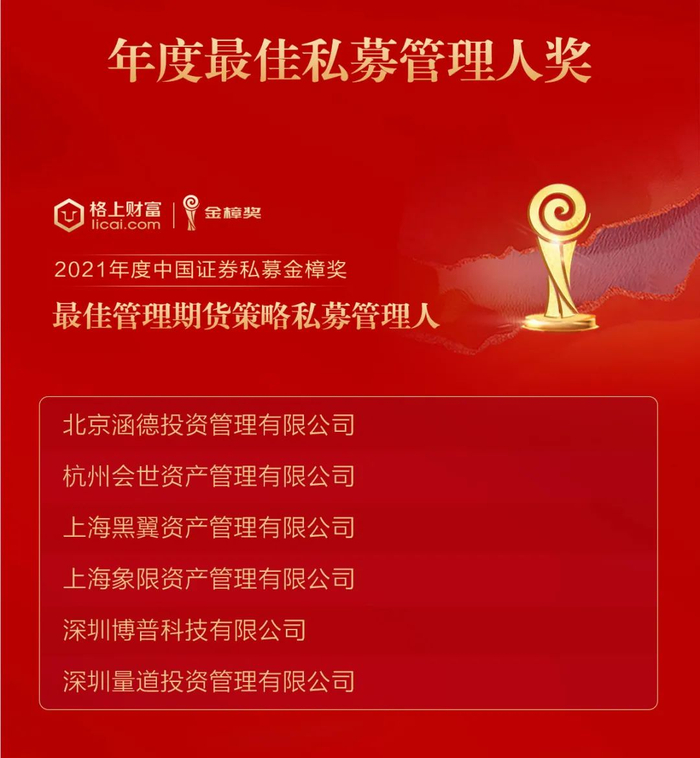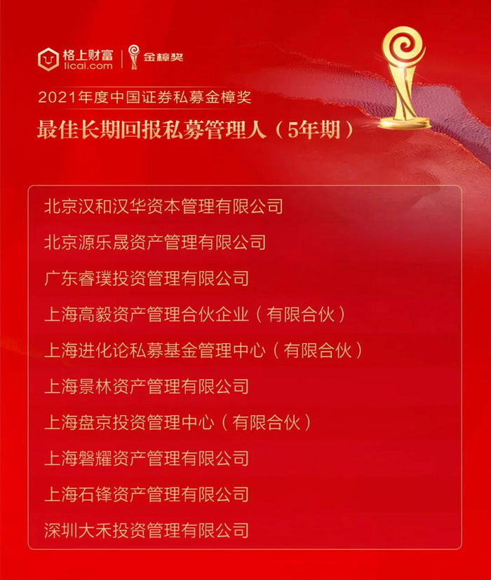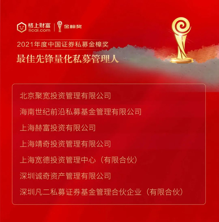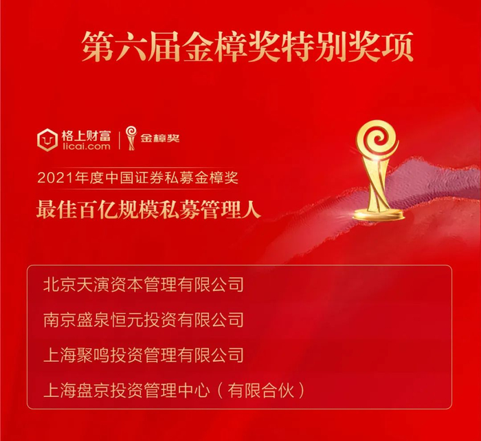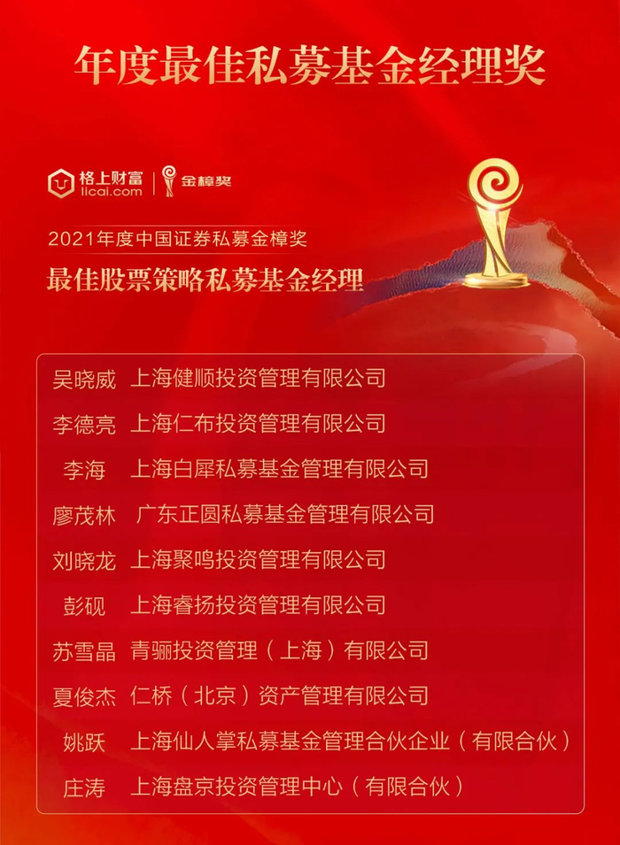 等八大奖项,最终去重统计共16位私募基金经理与34家私募管理人摘得第六届(2021年度)金樟奖荣耀桂冠,获奖率仅为0.5%!