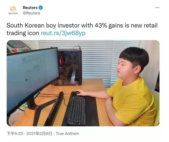 在韩国,有一名12岁的小学生,在这年纪不爱打游戏爱炒股票,一年炒股赚43%,被称为韩国小股神。