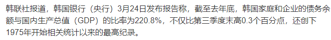 韩国家庭和企业的债务余额与国内生产总值(GDP)的比率为220.8%,是啥概念?