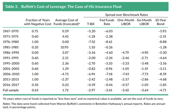 然而,伯克希尔-哈撒韦公司杠杆成本的异常主要是由于保险浮存金。预先收取保费,然后再进行分散的保险赔付,这就像接受了一笔“贷款”。表3显示,伯克希尔保险浮存金的估计平均年成本只有1.72%,比平均国债利率低约3个百分点。