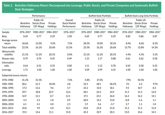 表2:伯克希尔-哈撒韦公司及系统性巴菲特式投资组合的收益分解:杠杆、上市公司股票、非上市公司
