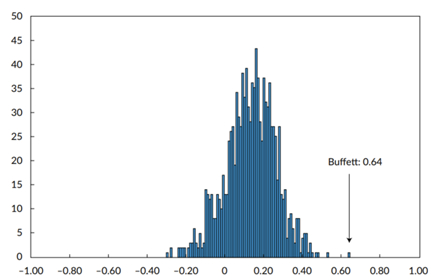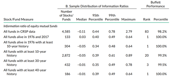 巴菲特在所有共同基金中排名前3%,在所有股票中排名前7%。然而,具有最高夏普比率的股票和共同基金往往只存在了很短的时间并运作良好,这具有很大的随机性。