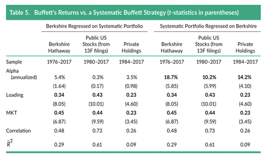 表5:巴菲特的回报与系统性巴菲特策略的对比(括号内为t统计量)