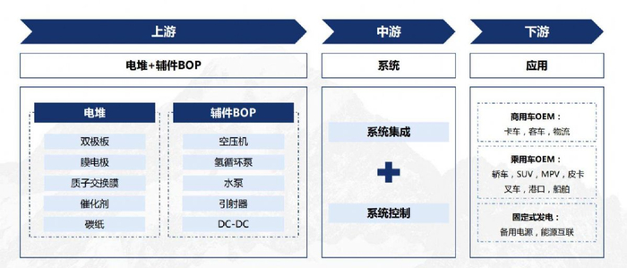氢燃料电池发动机产业链的上游可以分为,电堆厂商和辅件BOP厂商;中游则是负责机械集成和部分控制的系统厂商。