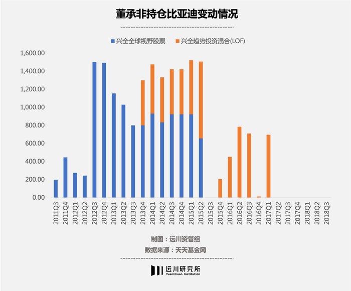 董承非首次买入比亚迪是在2011年三季度,2012年三季度到2015年二季度,比亚迪都在兴全全球视野前十大重仓股之列。2015年三季度,市场大幅震荡,董承非减持了比亚迪,但在不久后的四季度他又再次加仓,将比亚迪买入了前十大重仓股,而到2017年二季度开始逐渐减仓,此后持股数仅有1.7万股,直到2018年三季度完全清仓。