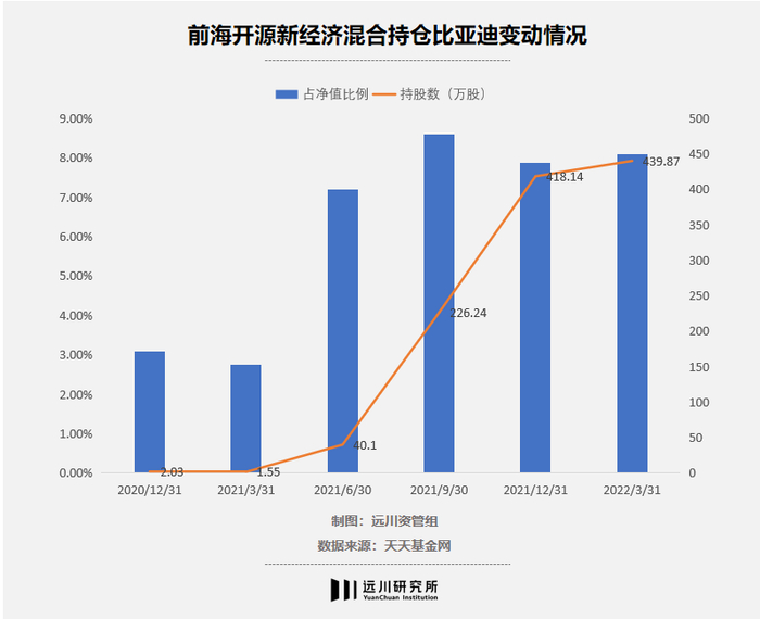 而到了今年一季度,比亚迪股价回调期间,崔宸龙却又开始“杀跌”。虽说前海开源新经济这只基金较四季度增持了21万股比亚迪,但是崔宸龙管理的另一只基金——前海开源公共事业较上一季度减持了116万股,总的来说,崔宸龙在今年一季度共减持比亚迪95万股。