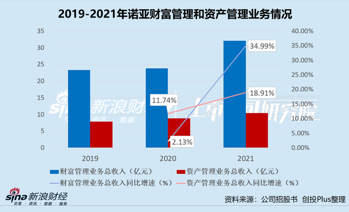 2019-2021年,诺亚财富管理总收入分别为23.30亿元、24.79亿元和32.12亿元,资产管理总收入分别为7.88亿元、8.80亿元和10.46亿元。2021年两大业务均有所复苏,财富管理业务同比增速近35%。