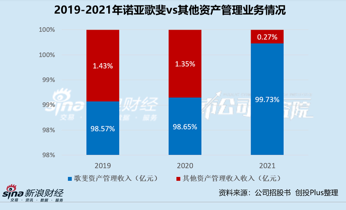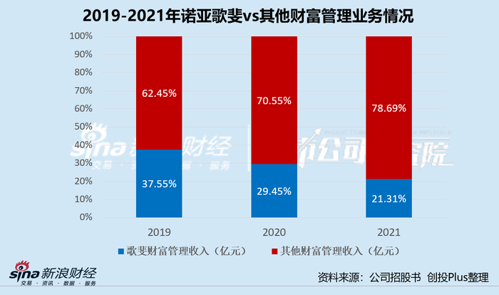 两大业务的快速恢复离不开歌斐资产的助力。2021年,歌斐总收入占比诺亚总收入近四成,诺亚财富管理业务总收入中有21.31%来自于歌斐所管理的基金,歌斐的管理费收入占财富管理业务管理费收入约38%。资产管理业务总收入的99.73%由歌斐所管理的基金产生,仅基金管理费一项就占据了诺亚资产管理业务管理费收入的99.81%。与往年相比,2021年歌斐在财富管理业务中的存在感明显降低,主要原因是2020年10月实施监管办法后,诺亚不再通过财富管理业务提供私募股权产品,歌斐可以直接向客户募集私募股权投资的资金。
