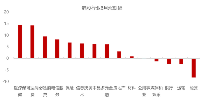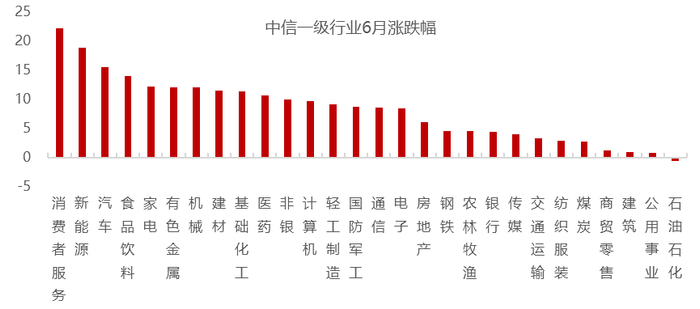分行业看,受益于疫情管控放松,前期调整充分的消费者服务板块本月反弹22%,领涨A股;线下消费的复苏也促使食品饮料板块表现回暖。在补贴政策持续出台叠加短期销量回暖的背景下,新能源车及其产业链表现亮眼,相关的新能源、汽车、有色板块也有不错表现;随着上游原材料价格回落以及地产销量的企稳,家电板块本月也有所反弹。跌幅榜上,石油石化板块受到油价回落影响表现不佳,下跌0.6%,是本月唯一下跌的板块。前5个月表现不错的建筑、公用事业、煤炭和银行板块表现一般,涨幅都在3%以下。港股表现和A股相似,医药、消费涨幅领先,而能源、交运和银行表现不佳。主题方面,6月表现好的主题主要集中在新能源车产业链、机器人和光伏板块。整体来看,6月表现好的行业主要集中在疫后修复和数据持续改善的成长行业。市场自5月反弹以来已经积累了一定涨幅,短期情绪修复已经基本到位,景气度无法匹配的超涨板块已经出现了一定的回调压力。展望后市,在全球流动性依旧紧张、国内经济弹性不足的背景下,市场继续大幅上涨的概率较小,短期市场可能面临回调阻力。