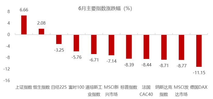 6月,海外央行加快了收紧的步伐,FOMC会议上美联储如期加息75个基点,为1994年以来最大的单次加息。随后,欧美央行不断放出无条件抗击高通胀等鹰派言论,市场交易逻辑从高通胀紧缩转向为对衰退的担忧。受此影响,全球股市普遍下行。分市场看,受到能源价格飙升影响最大的德国市场下跌11%,领跌主要市场。美股同样表现不佳,纳指和标普500都跌超8%。相比之下,坚持量化宽松的日本,其股市表现较好,仅下跌3.2%,领涨主要发达国家。