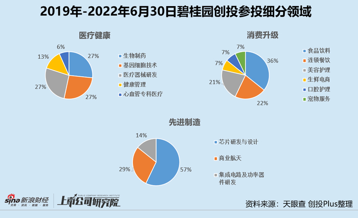 从投资领域来看,碧桂园创投在成立初期围绕房地产产业链上下游投资,房屋租赁交易平台贝壳找房、建筑涂料和节能科技公司固克涂料、卫浴家居产品帝欧家居和惠达卫浴以及建筑陶瓷生产商蒙娜丽莎都曾获得青睐。随后逐步将触角伸向医疗健康、消费升级和先进制造领域,2021-2022年上半年碧桂园创投在医疗健康、消费升级和新能源赛道共完成25笔投资,占期间总投资数约52.10%。