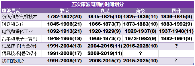 前四次周期争议不大,我们所处的第五次康波周期因为还没结束,大家还没有达成共识。第五次康波周期划分影响比较大的有两位,一位是天王周金涛,另一位是兴业银行的首席经济学家鲁政委。