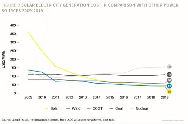 上图是欧洲光伏产业协会的不同能源度电成本数据。从2009年以来,光伏发电的成本下降很快,从35美分每度电,一直到2019年的4美分每度电,而传统的核电和煤电,度电成本变化不大。目前光伏已经是成本最低的发电方式,2020年已经实现了平价上网,下一步将是努力摆脱并网约束,成为主导能源。