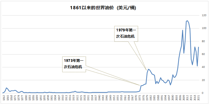 1971年布雷顿森林体系瓦解,美元与黄金脱钩,彻底成为一种信用货币,以美元计价的大宗商品的波动率陡然放大。在1961-1970年这十年中,原油一直都是1.80美元每桶,1971年为2.24美元每桶,1973年涨到3.29美元每桶,第一次石油危机后的第二年也就是1974年飙升到11.58美元每桶,1979年第二次石油危机,这个数字又飙升到31.61美元每桶。通胀之母原油价格的暴涨,也带来了那段时间美国爆表的通胀。