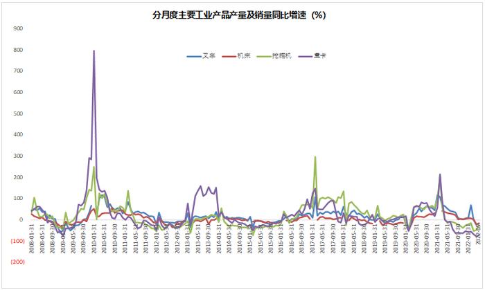 如果我们再叠加叉车和金属切削机床月度产量或者销量的同比增速之后,如上图,我们发现,这四类工业品的月度同比走势基本是一致的。
