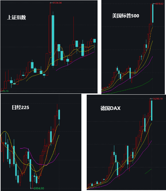 我没有找到为什么年线的二十年线是国运线的原因,但我把上证指数以及其他的三个重要的世界股市指数美国标普500、日经225和德国DAX指数的年线都找了出来,所有图上的紫色线都是二十年线。