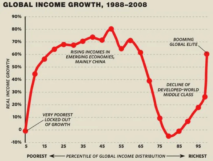 如果说前四次周期技术进步还算明显的话,第五次周期并没有带来生产力的大的进步。从第五次康波的1991年到现在,我们能看到的进步无非就是新出现了几个互联网巨头,软的的确够软,但在硬科技上确实没有多少进步。这种技术进步本身能带来的财富或者生产力进步有限,就是在发达国家也只能养活少数的一群人,并不能惠及全部国民。技术停滞必然带来先发优势弱化,技术向发展中国家扩散,客观上造成了发展中国家中产阶级收入的增加。这种变化体现在收入增长就是我们看到的大象曲线。