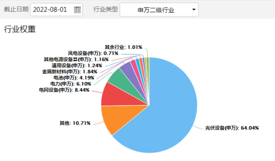 在行业分布上,根据Choice数据显示,光伏产业指数申万二级成份行业中,光伏设备行业权重最大,占比约64%。